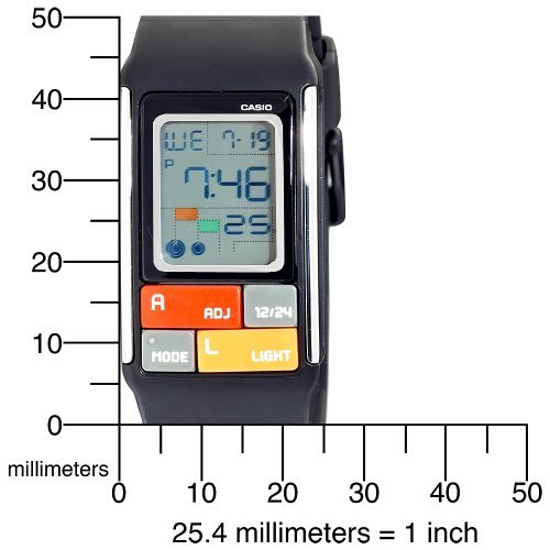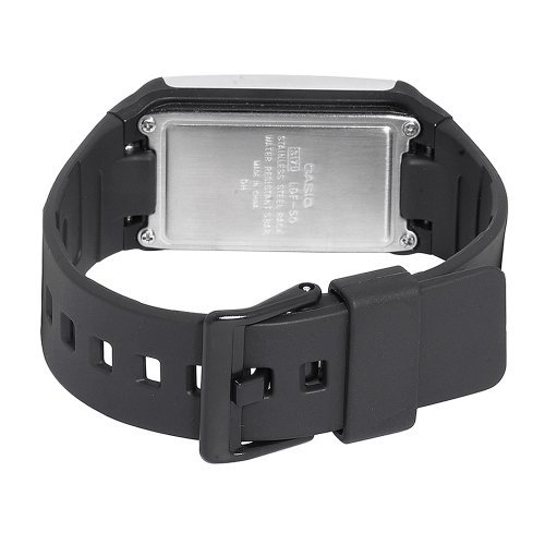 The Casio Women's Pop Tone Black Digital Watch #LDF50-1CF combines minimalism with a futuristic fashion aesthetic. Colorful and distinctly feminine, this Casio offers a digital display (that's backlit when needed) with large numbers and large quadrant keys housed in a cute, slim case. Other fashion highlights include a black resin band with a traditional buckle. Water resistant to 165 feet (50 meters), this watch also includes a 1/100 second stopwatch that can record split time, a fully automatic calendar (pre-programmed until the year 2099), an alarm, and a three-year battery.Feature