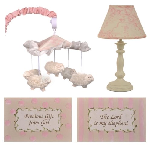 A quality baby bedding set is essential in making your nursery warm and inviting. All Cotton Tale Designs patterns are made using quality materials and are uniquely designed to create your perfect nursery. The Heaven Sent Girl Collection is a beautiful combination of Pinks and Cream. The Heaven Sent Girl Decor kit includes two piece Wall Art, Standard Lamp, and Mobile. A 2 piece set of hand painted, light weight wall art. Painted on natural canvas foam board with natural twill ties. The art reads The Lord is My Sheppard and Precious gift from God. These pieces measure 14" x 10". The sturdy lamp base is antique ivory with a floral cream and pink shade. Lamp adds a decorative touch to the nursery measuring 19". Spot clean only, max bulb is 60 watt. Part of the Heaven Sent Girl Decor Kit is the musical mobile, 5 furry sheep circle the ruffled canopy, wind up music box playing Brahms lullaby. Arm cover in pink floral. Spot clean only. Mobiles are not toys. They should be removed from the crib when baby can sit up unassisted. Perfect for your little angel. All items can be spot cleaned or dusted.Feature