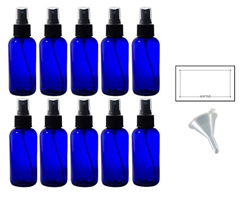 4 oz Cobalt Blue Glass Boston Round Fine Mist Spray Bottle (10 pack) + Funnel and Labels for essential oils, aromatherapy, food grade, bpa free