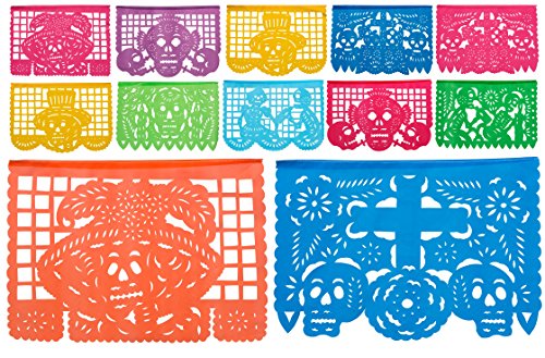Day of the Dead Medium Plastic Papel Picado "Dia De Los Muertos" - 12 Medium Plastic Panels, Over 16 Feet Long Hanging - Designs and Colors as Pictured by Paper Full of Wishes