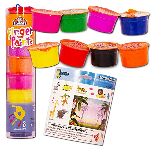 Elmer's Finger Paint Set for Toddlers and Kids -- Pack of 8 Classic Colors. This finger painting set includes 8 colors -- green, blue, pink, yellow, purple, orange, red and black. This finger painting set provides hours of artistic fun and is great for toddlers and kids to develop creativity by blending and mixing colors. Elmer's Finger Paint Set is washable and parents can feel at ease when their toddlers and kids are playing. This finger painting set is perfect for arts and crafts, birthday gifts, party supplies, party favors and more. This Elmer's Finger Paint Set also includes over 30 stickers.