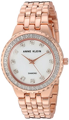 -. Binding : Watch -. Brand : Anne Klein -. Color : Rose Gold -. Department : womens -. EAN : 0086702590469 -. Feature : Coin edge bezel with pave top ring set with 12 genuine diamonds; slightly domed mineral crystal; mother-of-pearl dial with rose gold-tone luminous hands and 12 genuine diamond markers / Rose gold-tone adjustable link bracelet; fold over clasp with double push-button safety / Japanese-quartz Movement / Case Diameter: 34mm / Water resistant to 30m (100ft): in general, withstands splashes or brief immersion in water, but not suitable for swimming or bathing -. Label : AK Anne Klein -. Manufacturer : AK Anne Klein -. Model : AK/2760MPRG -. MPN : AK/2760MPRG -. PartNumber : AK/2760MPRG -. ProductGroup : Watch -. ProductTypeName : WATCH -. Publisher : AK Anne Klein -. Studio : AK Anne Klein -. Title : Anne Klein Women's Quartz Metal and Alloy Dress Watch, Color:Rose Gold-Toned (Model: AK/2760MPRG) -. UPC : 086702590469