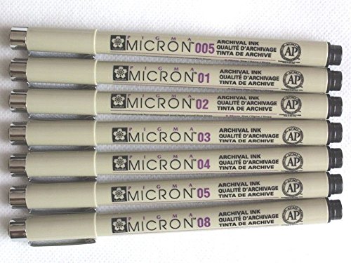 -. Feature : Model: 005=0.2mm 01=0.25mm 02=0.3mm 03=0.35mm 04=0.4mm 05=0.45mm 08=0.5mm / Item include: standard 7 pc (005 01 02 03 04 05 08)x1 =7 PCS / Ink: black / Smooth writing. High quality . PIGMA Color Technologies .Chemical-resistant. / PH nuetral. Water proof. Deal for acid-free environments.