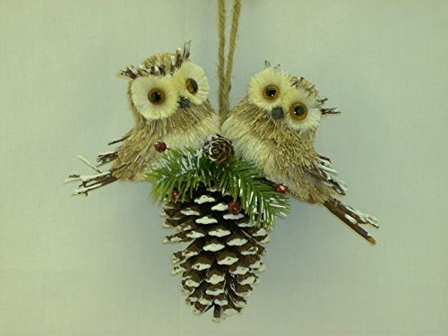 Christmas Owl Couple Sitting on Frosty Pinecone Ornament 9" x 7"