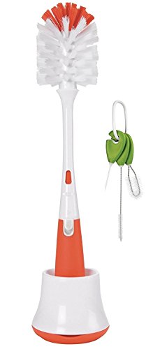 -. Binding : Baby Product -. Brand : OXO -. Feature : Brush head has two types of bristles for gentle cleaning and serious scrubbing / Flexible neck for easy reach inside bottles / Silicone nipple cleaner gets into tight spaces and is ideal for bottle nipples, sippy cup or breast pump parts / Cleaning brush set consists of 3 tools; straw brush, lid and pump parts brush and sippy spout cleaner / Dishwasher Safe -. IsAdultProduct : 0 -. Label : OXO -. Manufacturer : OXO -. ProductGroup : Baby Product -. ProductTypeName : BABY_PRODUCT -. Publisher : OXO -. Studio : OXO -. Title : OXO Tot Bottle Brush with Nipple Cleaner and Stand with Cleaning Brush Set