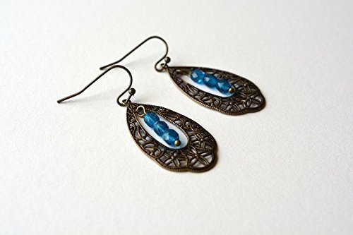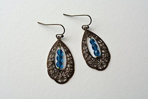 -. Title : Brass Filigree Dangle Earrings Blue Beaded Victorian Style Antiqued Brass Glass