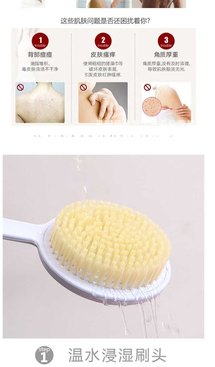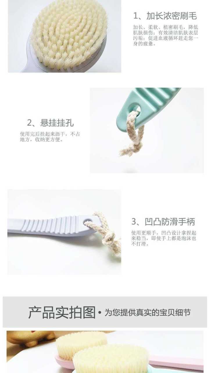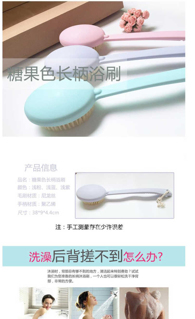 【糖果色长柄浴刷】颜色:浅粉 浅蓝 浅紫 毛刷材质:尼龙丝 手柄材质:聚乙烯 尺寸:38*9*4.4CM(手工测量少许误差) 产品质量上乘、加长浓密毛刷、悬挂式设计、凹凸防滑手柄、 有了它,搓背再也不求人了,舒适刷毛,防脱手柄,不仅可以轻易的清理角质,还可以来一次全身的按摩,洗去一天的疲乏,给您带来全新的沐浴体验!不发霉不变形不易掉毛,挂起来很快就干了,避免滋生细菌!好处多多 家庭成员较多的亲,建议一人一只,这样会比较卫生!