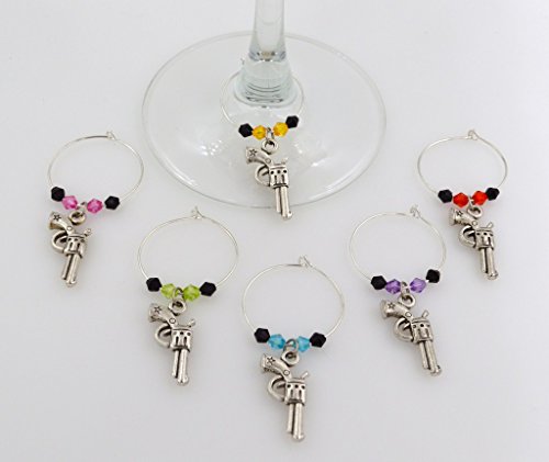 -. Brand : It's All About...You! -. EAN : 0740175278704 -. Feature : This set of 6 wine glass charms is decorated with a gun charm on each ring. / Keep track of your drink glass at your next party with 6 different colored beads and gun charms. / Each gun is 1" long and 1/2" wide. / Wine glass charm rings are 25mm and easily fit most wine glasses. / This set comes packaged in a Black Velour Gift Bag - making it an amazing present or favor for a hostess, housewarming, wedding, bridal shower or bachelorette party -. Label : It's All About You Jewelry -. Manufacturer : It's All About You Jewelry -. MPN : WGC-GUN-S1 -. PackageQuantity : 1 -. PartNumber : WGC-GUN-S1 -. ProductGroup : Kitchen -. ProductTypeName : KITCHEN -. Publisher : It's All About You Jewelry -. Studio : It's All About You Jewelry -. Title : Gun Wine Glass Charms - 6 Piece Cocktail Drink Charm Set in Black Velour Gift Pouch (WGC 48G) -. UPC : 740175278704