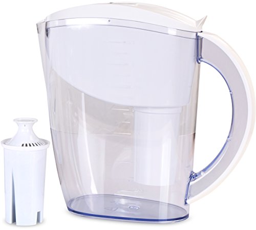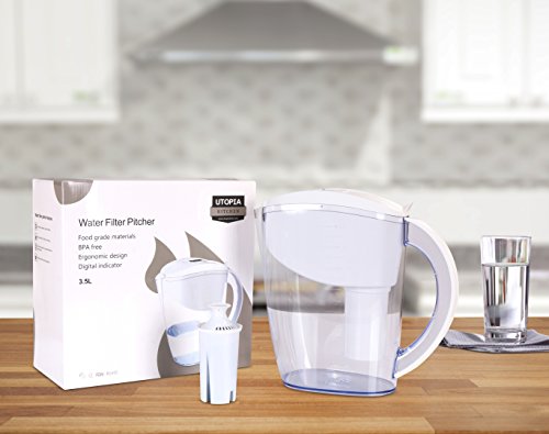 Brilliantly Modelled Water Pitcher Utopia's 10 cup water pitcher with easy to use filter is a great item to keep in your kitchen. Its advance filter technology and large size helps in delivering the finest of performance with a great serving size at a time. Great Utility It's a BPA-Free pitcher with sticker filter change indicator and easy fill lid. The sticker filter indicator informs when the water filter needs to be changed so that prompt action is taken. It reduces chlorine taste, odor, copper, mercury, and cadmium to deliver healthy water for a better life. For best utility, change the filter after every 40 gallons or 2 months.Feature