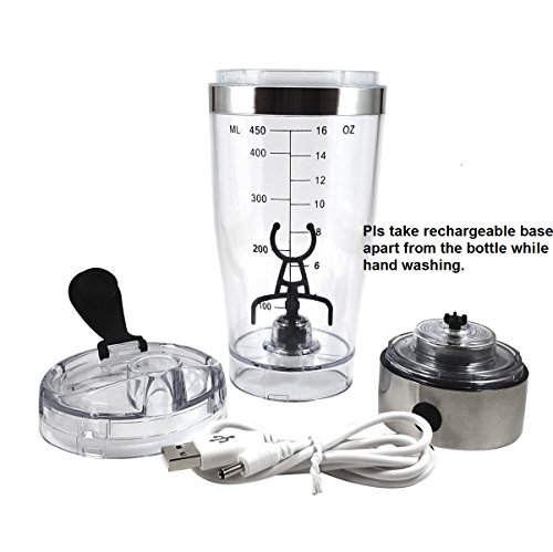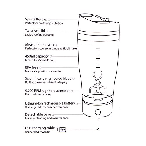 USB Rechargeable Vortex Mixer:No need for extra batterie.The shaker bottle comes with a USB cable to charge it anywhere,such as home,office,gym,car even on the go if there is a power bank