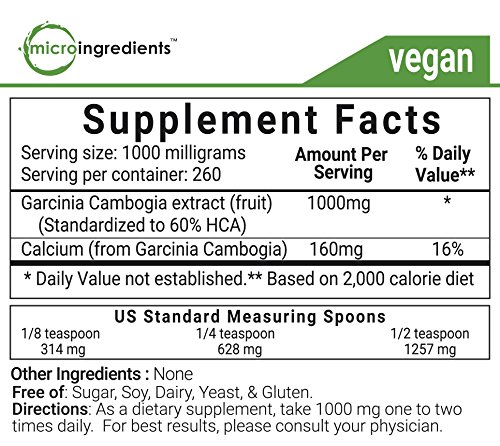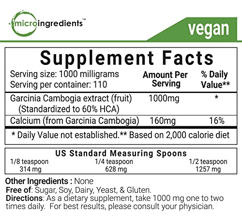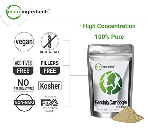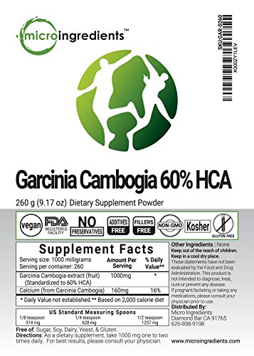 -. Binding : Health and Beauty -. Brand : Micro Ingredients -. Feature : Natural active ingredient: 60% HCA (hydroxycitric acid). / 100% Pure powder. Clean & vegan. No additives or preservatives. / Non-GMO. Lab tested. Packed in FDA registered facility in California. -. IsAdultProduct : 0 -. Label : Micro Ingredients -. LegalDisclaimer : These statements have not been evaluated by the Food and Drug Administration. This product is not intended to diagnose, treat, cure or prevent any disease. If pregnant/lactating or taking any medications, please consult your physician prior to use. -. Manufacturer : Micro Ingredients -. ProductGroup : Health and Beauty -. ProductTypeName : HEALTH_PERSONAL_CARE -. Publisher : Micro Ingredients -. Studio : Micro Ingredients -. Title : Micro Ingredients Garcinia Cambogia HCA 60% Powder