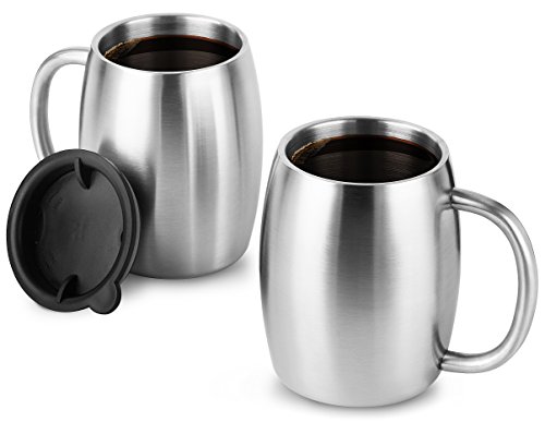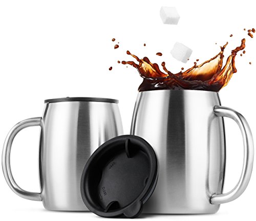 Unbreakable, insulated, dishwasher safe 13.5oz stainless steel coffee mugs with travel lids - in beautiful gift packaging.