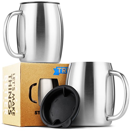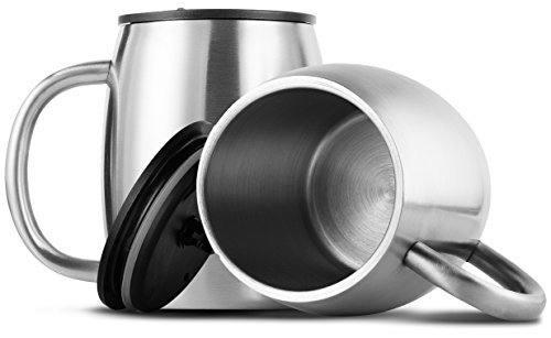 ★ BEAUTIFUL MUGS TO FALL IN LOVE WITH - Tru Blu Steel set of 2 elegant brushed metal coffee mugs with handles - comfortable, ergonomic & easy to grip. You'll love our sleek, modern coffee cups. No more spilled coffee! Includes 2 travel lids and wide, stable bottom designed for flush placement on counter and table tops.