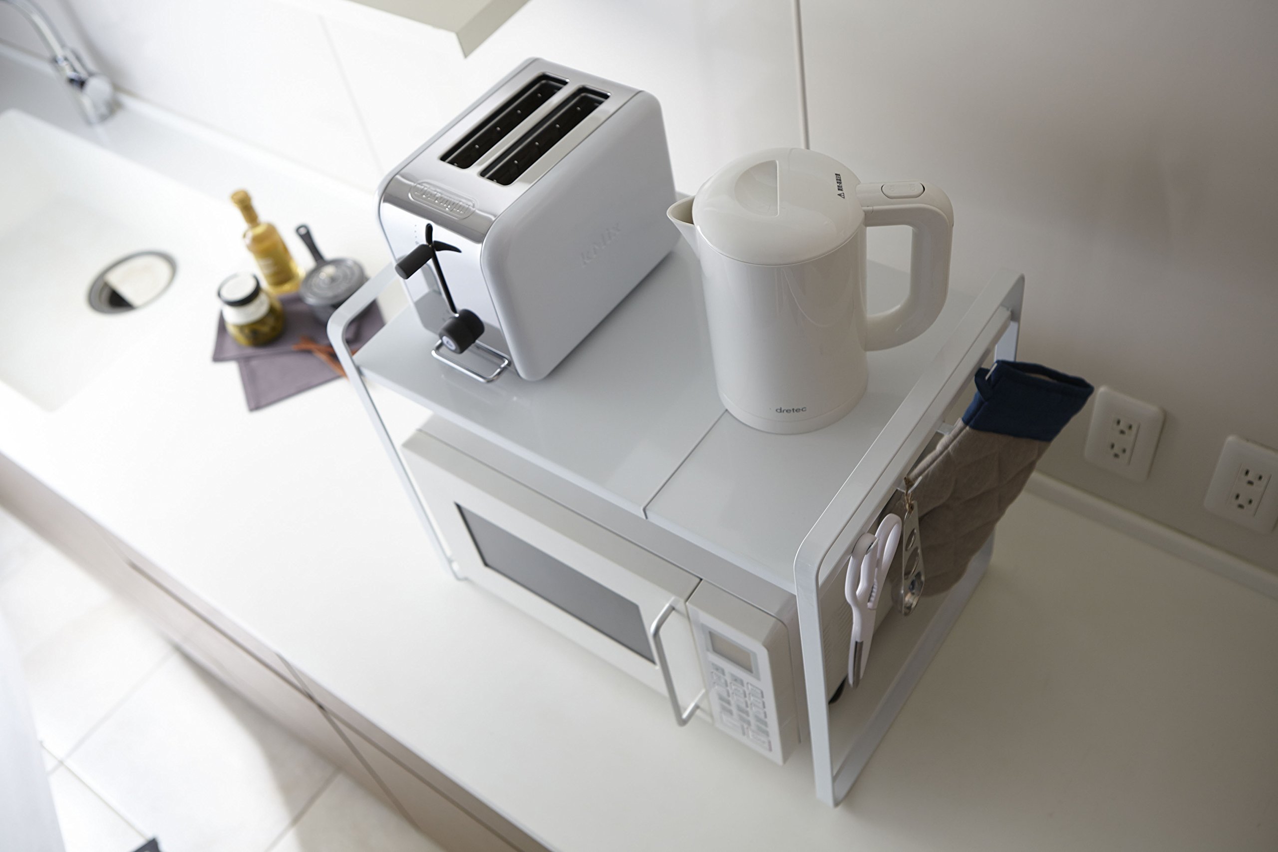 Simple and easy to use A microwave storage rack that can stretch from about 47.5 to 75 cm.
