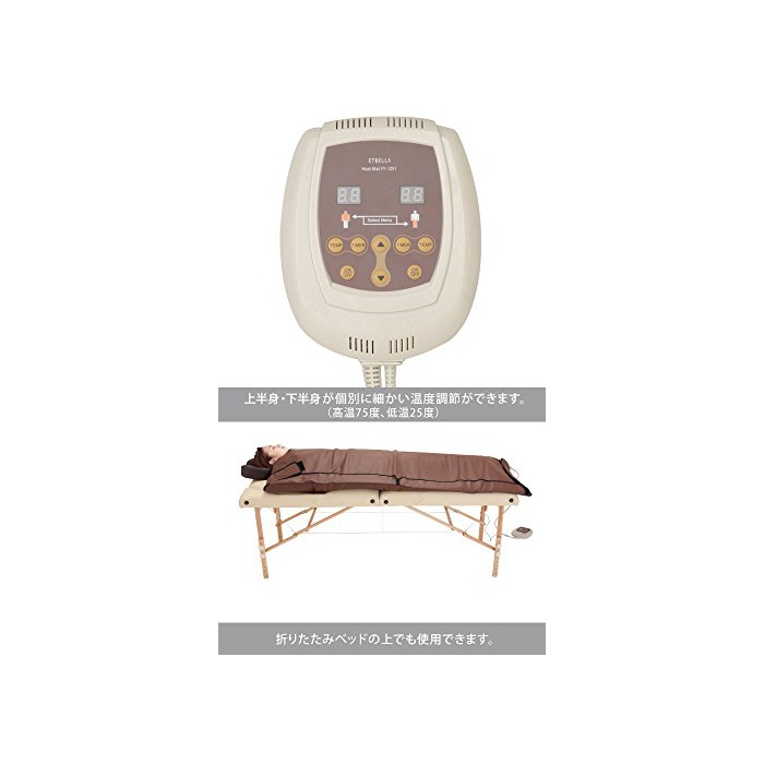 【상품 설명】시즌을 불문하고 보디 케어에 빠뜨리지 않는 사우나 매트.신체를 확실히 싸 재는 타입입니다.온도는 고온도70도~저온25도를 디지탈 표시에 세세하게 설정 가능.상반신,하반신을 각각 개별로 온도 조절로 옵니다.발한용으로서 이용 하실 수 있습니다.