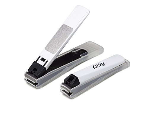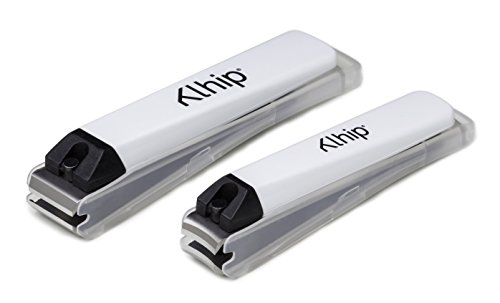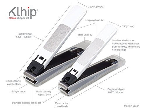 SET OF TWO - Nail specific set Includes both a large straight-bladed toenail clipper and a medium sized curved-bladed fingernail clipper. Both with integrated nail file and automatic clipping catchment system. Please see annotated image above for clipper dimensions.