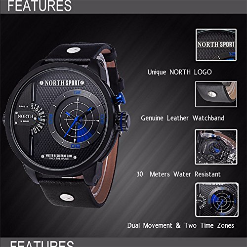 -. Feature : DURABLE: Japanese quartz movement with analog display, provide precise and accurate time keeping. Stainless steel water proof case cover / UNIQUE DUAL DIAL FASHION: dual dial design with two time zone, decorational compass and thermometer, leather band, bring you the lead edge fashion. Also make it a great gift for family or friends / DURABLE with COMFORT: durable stainless steel case cover with normal water proof, soft PU leather watch band provide you comfortable wearing experience. Combines quality, leading edge fashion, and value / Transparent dial with skeleton design.High quality scratch resistant mineral glass / COMFORTABLE and WATERPROOF: 98 ft waterproof (30 M) - 3ATM. daily waterproof design, not suitable for swimming, diving, shower, ect. Do not press any key underwater. Soft PU leather watch band provide ultra comfort when wearing