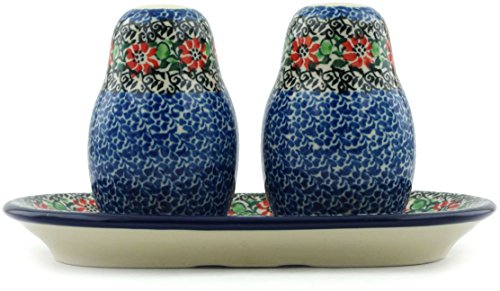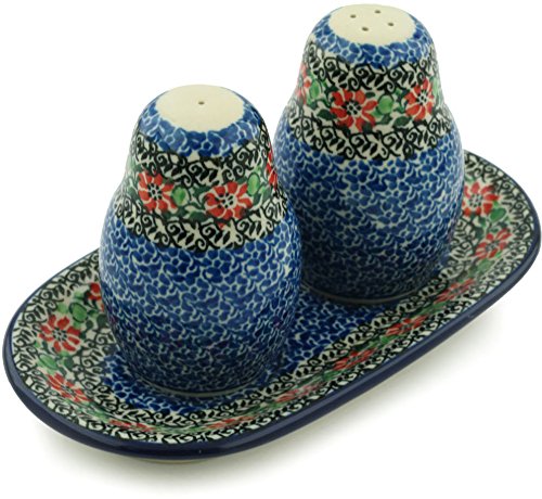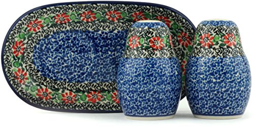 Polish Pottery Salt and Pepper 3-Piece Set made by Ceramika Artystyczna (Red Zinnia Theme) + Certificate of Authenticity