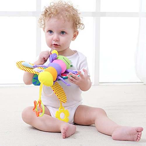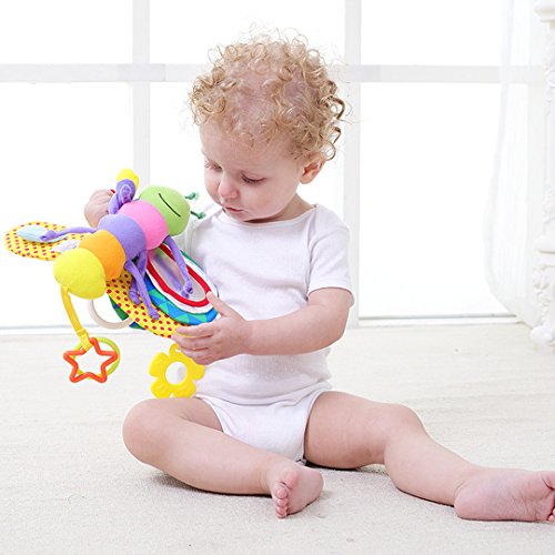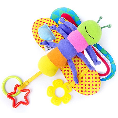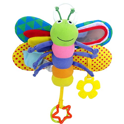 It has a soft plush body with various bright colors patterns and textures to stimulate all the senses.Butterfly busy wings with a BB device and 4 sound paper make sound to attract baby's attention.Butterfly head include two antennae, butterfly wings have a safe mirror for interactive play and develope a sense of self.Colorful round ring and five-pointed star ring to develope baby grasp ability.Flower teether for teething baby to chew.Hanging hook lets you easily clip up to strollers, carriers and diaper bags to take him along for on-the-go fun.