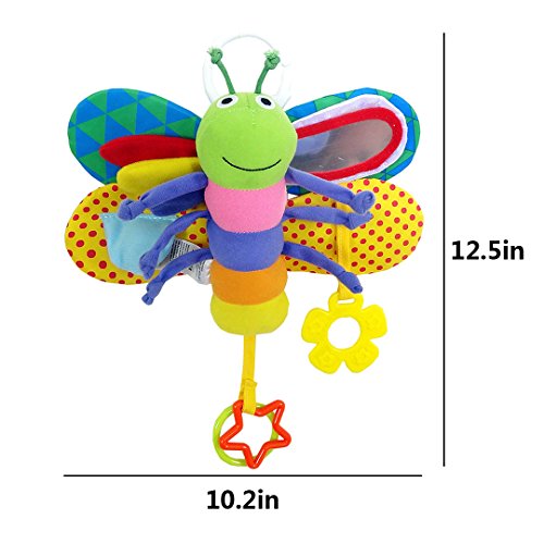 MULTIFUNCTION - Mirror play helps baby learn how to focus, track images and explore the face; Colorful rings awaken grasp ability;Fun sound will delight and keep baby entertained, capture baby's attention;Soft velour body and multiple textures on the wings keep baby engaged;Flower teether helps to sooth baby's gums