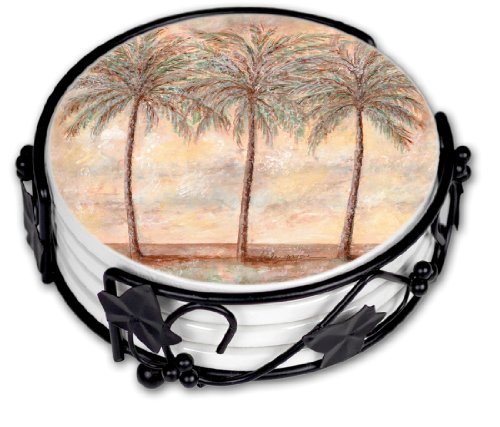 - 5-piece coaster set has four beautifully decorated porcelain coasters with a decorative, scrolled metal holder