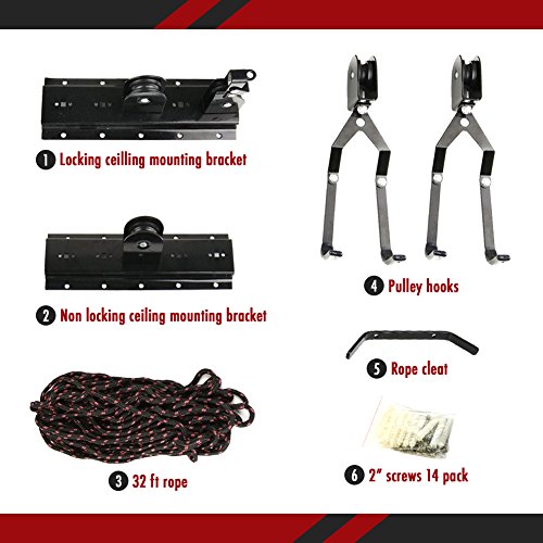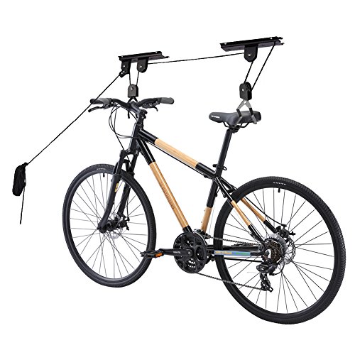 - SAVE YOUR EFFORTS FROM TODAY - Why settle for tough? For under $25.00, our bike rack is very easy to install and mount on your garage ceiling, and can be hoisted up with light or medium strength. For a maximum ceiling height of 9.8 ft, the 32 ft adjustable rope can effortlessly be lowered by losing and wrapping it around the mounted cleat with 3 swivel pulleys. Totally user friendly - get your cash back within 30 days if otherwise!