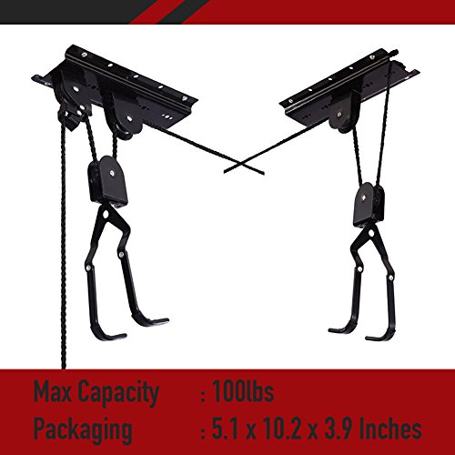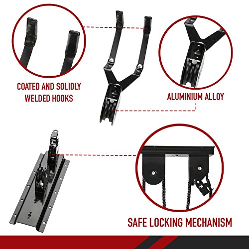 - DAMAGES OR ACCIDENTS ARE THINGS OF THE PAST - Our coated and solidly welded hooks greatly protect your bikes from scratches, while our thick hoist rope is very sturdy and lifts really heavy bikes up to 100 lbs horizontally with a safe locking mechanism. Say goodbye to all your worries about bike damage or potential collapses - your safety is our main priority!
