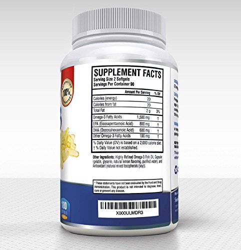 - Feature : HIGH STRENGTH for maximum benefit with 800mg EPA and 600mg DHA to exceed the minimum daily recommended intake suggested by Omega 3 experts. / LEMON FLAVOR - NO FISHY AFTERTASTE - unlike some cheaper, inferior fish oil products these softgel capsules are easy to swallow and don't cause fishy burps that you may have experienced elsewhere. / QUALITY GUARANTEED - This product is SUSTAINABLY SOURCED through a "Friends of the Sea" accredited process. It is manufactured in the USA at an FDA REGISTERED, state of the art Laboratory under GMP MANUFACTURING GUIDELINES going through a 2 stage molecular distillation process for MAX PURITY. This ensures any heavy metals or toxins are removed and is PCB tested and guaranteed to the most stringent standards. / RESULTS MAY COME QUICKLY - Say goodbye to the old you as the significant benefits of OMEGA 3 start to kick in. Many users report benefits including brain boosting, help in reducing cholesterol, decreased inflammation and joint pain, increased heart health, as well as support to your immune system, protecting your vision and promoting general welbeing. YOU MAY BE SURPRISED AT THE RESULTS / WHEN YOU ORDER NOW, you will receive a 3 MONTH SUPPLY of the BEST OMEGA 3 SUPPLEMENT available, knowing that your 90 day supply is protected by our 90-day, 'NO PROBLEM' Guarantee even if you return the bottle completely empty. Your purchase today is 100% risk-free!
