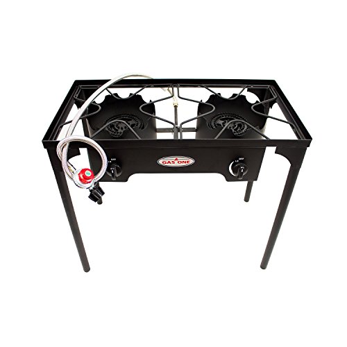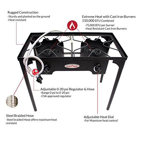 - PROPANE DOUBLE BURNER FOR OUTDOOR COOKING Equipped with two burner heads, each exuding 75,000 BTU (for a total of 150,000 BTU), Gas One’s Double Burner provides extreme heat for various different cooking scenarios. From tailgating to catering, this burner stands out for those looking for a little more range in their heat