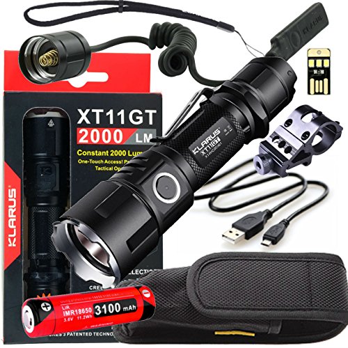 Klarus Upgraded XT11GT WEAPON BUNDLE w/ LED Tactical Rechargeable Flashlight, 18650 Battery, TRS1 Remote Pressure Switch, Offset Gun Mount, USB Cable, Lanyard, Holster, Pocket Clip, and USB Mini Light