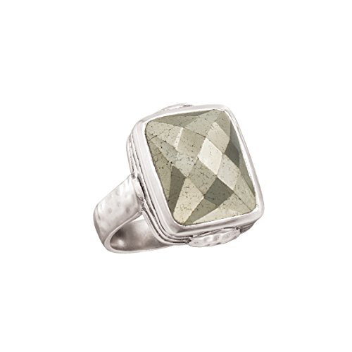 -. Feature : A faceted 17 1/2 ct pyrite stone bezel-set in a sterling silver band makes this statement ring stand out from the rest / MODERN GEO: Your high school geometry class couldn't have prepared you for the geo trend taking over the runways! These sterling silver styles are designed from shapes like triangles, crescents, circles and chevrons that take on a more organic, hand-crafted look with the help of brushed, textured or hammered detailing. These modern designs can be paired with your favorite geometric patterned top for a head-turning look or simply accessorize your go-to casual ensemble with a dash of mod glam. / PYRITE: This natural mineral gleams with a beautiful metallic luster / STERLING SILVER: Silpada's signature metal is known amongst jewelry wearers for its strength, brightness, shine, and decreased risks of allergic reactions and tarnish residue on skin / Ring face measures 7/8 inches in width