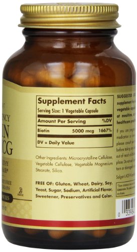 -. Binding : Health and Beauty -. Brand : Solgar -. Color : Parent -. Feature : Supports energy production in the body / Required for protein, carbohydrate, and fat metabolism / Suitable for Vegetarians -. Label : SOLGAR -. Manufacturer : SOLGAR -. PackageQuantity : 1 -. ProductGroup : Health and Beauty -. ProductTypeName : HEALTH_PERSONAL_CARE -. Publisher : SOLGAR -. Studio : SOLGAR -. Title : Solgar - Biotin Super Potency 5000 mcg.