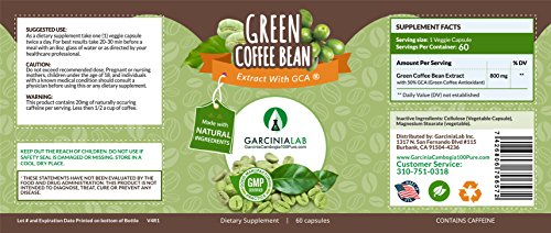 -. Binding : Health and Beauty -. Brand : GarciniaLab -. Feature : NATURAL & SAFE WAY TO LOSE WEIGHT - Our Green Coffee bean extract is made only from PURE and NATURAL green bean coffee 1600MG per serving size. This is a powerful fat burner to help you lose weight naturally and effectively. / BEST VALUE ON AMAZON! 1-2 MONTH - 800-1600 MG PER SERVING at 1 or 2 servings a day! You receive 60 veggie capsules for a FULL 30-60 day supply backed by the GarciniaLab guarantee of 100% MONEY BACK GUARANTEE for 15 day if you are dissatisfied with our product. / HELPS YOU BURN UNWANTED FAT - Green Bean Coffee Extract is a leading supply of weight loss supplements as it reduces your bodies formation of sugar to be carried in your body. Thus less fat is created. Helps you lose weight you've always wanted to get rid of. / NATURAL FORMULATION: No unnecessary fillers, binders, or potentially harmful preservatives or GMOs. No side effects when taking our green coffee bean extract! Our product is made in the USA and backed by our 100% satisfaction guarantee. Made in a FDA Registered Facility and product Tested by 3rd party labs for potency accuracy. / BUY WITH CONFIDENCE - U.S.A made with care & integrity at FDA Registered Certified GMP facility. 100% RISK FREE GUARANTEE - Get results when taking our Green Coffee Bean Extract. It's that simple. -. IsAdultProduct : 0 -. Label : GarciniaLab Inc. -. LegalDisclaimer : Must be at least 18 years to purchase. Consult with a doctor if you have a medical condition or take any medication. -. Manufacturer : GarciniaLab Inc. -. MPN : GCBA -. PackageQuantity : 1 -. PartNumber : GCBA -. ProductGroup : Health and Beauty -. ProductTypeName : HEALTH_PERSONAL_CARE -. Publisher : GarciniaLab Inc. -. Studio : GarciniaLab Inc. -. Title : Green Coffee Bean Extract 100% Pure Weight Loss Supplement 50% Chlorogenic Acid Made in USA