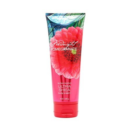 -. Feature : Bath & Body Works / Midnight Pomegranate scent is A fiery blend of ruby red pomegranate, blackberry spice & sparkling cassis / 8 oz 24 hour moisture ultra shea body cream / Infused with luxuriously rich Shea Butter, soothing Aloe Butter and pampering Cocoa Butter / Non-greasy formula melts into skin to provide beautiful fragrance and all day, all night hydration