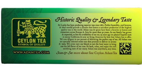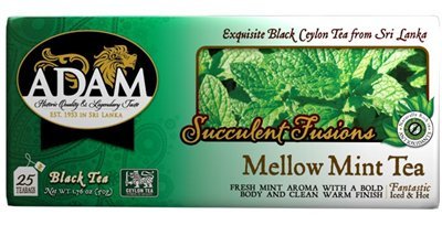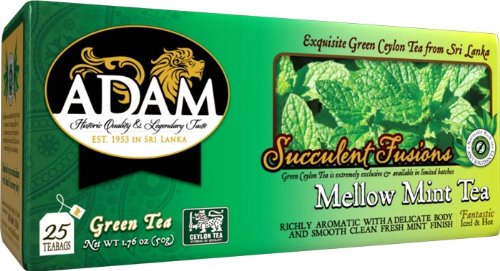 -. Binding : Grocery -. Brand : Adam -. EAN : 0858194003723 -. Feature : Case of 3 boxes, each containing 25 individually wrapped tea bags (75 total tea bags) / 100% Pure Ceylon, green tea, flavored with real mint leaves and all natural mint flavor / Marked with Ceylon Symbol Of Quality Logo indicating premium quality tea / Special Double Chamber tea bags filled with 2 grams of tea to maximize infusion / Fantastic Iced or Hot; One tea bag makes 12 - 16 ounces of iced tea and 6 - 8 ounces of hot tea -. Label : Adam Expo -. Manufacturer : Adam Expo -. MPN : 858194003723 -. NumberOfItems : 1 -. PackageQuantity : 1 -. PartNumber : 858194003723 -. ProductGroup : Grocery -. ProductTypeName : GROCERY -. PublicationDate : 2015-02-07 -. Publisher : Adam Expo -. ReleaseDate : 2015-02-07 -. Size : 1.67 Ounce -. Studio : Adam Expo -. Title : Adam Mellow Mint Green Tea, 1.67 Ounce -. UPC : 858194003723