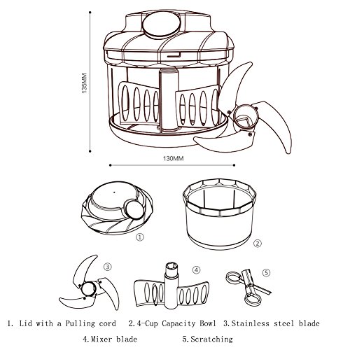 LARGE & SAFE TO USE: 4 Cup Capacity. Great for all kitchens, RVs, travel and camping. Made from BPA free, food safe plastic. Blades are all concealed during use for the utmost safety.Simply put food or ingredients in the container, twist and lock the lid, and pull the cord to spin the chopping blades