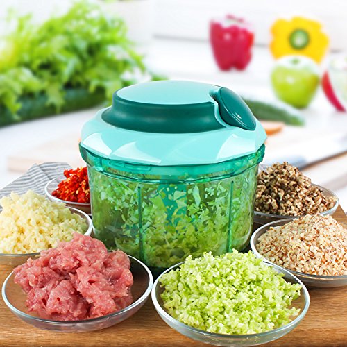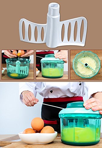 MANUAL CHOPPING & BLENDING JOB: This hand food chopper takes the hard work out of chopping & blending vegetables, fruits, nuts and herbs. Features sharp stainless steel blades for fast and even chopping/mincing, comfort soft grip lid, anti-skid base, easy pull cord, and a large handle. Also comes with an extra mixer blade for effectively mixing/blending ingredients