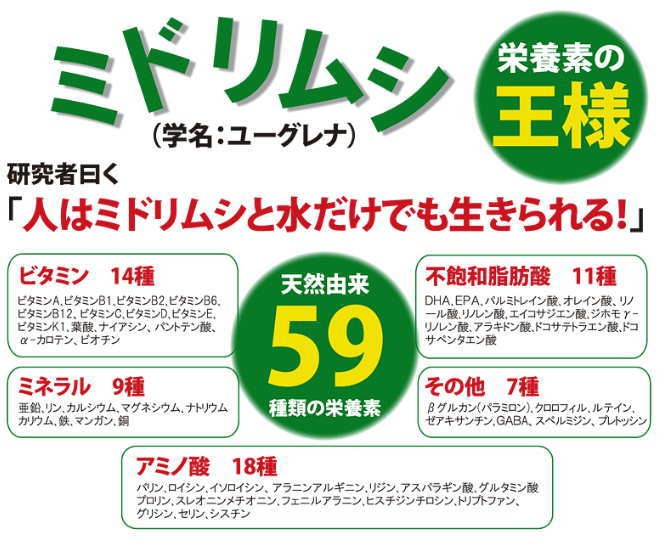 | ●「ユーグレナ(みどりむし)」配合サプリメントです。 ●59種類の天然栄養素を含んでいます。 ●「イヌリン(食物繊維)もプラスしました。 ![]() ![]() ビタミン・ミネラル・アミノ酸・不飽和脂肪酸・葉緑素などをバランス良く含んだ「ユーグレナ(みどりむし)」と、水溶性食物繊維「イヌリン」を配合したサプリメントです。 100%自然由来の栄養素を摂取したい方におすすめいたします。 『 動物+植物の特長を併せ持った微生物 』 ユーグレナは、5億年以上前に地球で誕生した微生物です。 “(鞭毛で)自ら動く=動物”と、“葉緑体を持つため光合成をし、太陽の光と二酸化炭素だけで栄養素をつくり出す=植物”の特長を併せ持っています。 『 栄養の宝庫!小さいけどすごい!』 ○ビタミン:β−カロテン、B1、B2、B6、B12、C、D、E、K1、葉酸 ○ミネラル:鉄、亜鉛、カルシウム、マグネシウム、カリウム、リン、ナトリウム ○アミノ酸(必須アミノ酸含む計18種):バリン、ロイシン、イソロイシン、アラニン、アルギニン、リジン、アスパラギン酸、グルタミン酸、プロリン、シスチン、スレオニン、メチオニン、ヒスチジン、フェニルアラニン、チロシン、トリプトファン、グリシン、セリン ○不飽和脂肪酸:DHA、EPA ○パラミロン:β−1,3−グルカンが、三重螺旋に結合した高分子多糖類(食物繊維と似た性質を持つ) ○葉緑素(クロロフィル) |