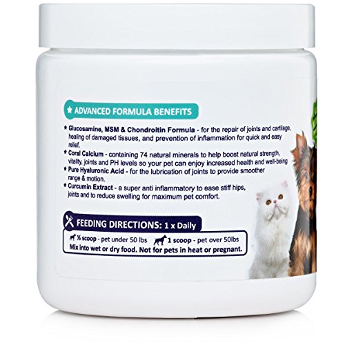 IMPROVES MOBILITY AND REPAIRS JOINTS: If your dog is suffering from joint pain or other issues, his or her entire quality of life can suffer. Our natural dog hip and joint supplement powder is simply the most advanced, easiest and best value on the market. The special blend of Glucosamine, Chrondroitin and MSM works to repair joints and cartilage, heal damaged tissues and prevent inflammation for quick and easy relief.