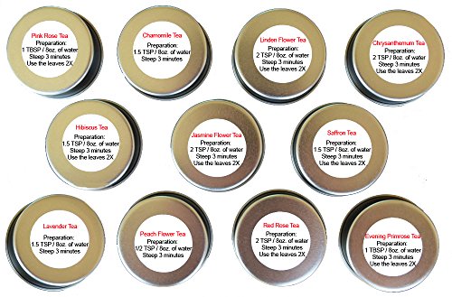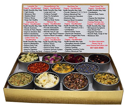 -. Feature : Tea Sampler - 11Teas / Premium Loose Leaf Tea Included - Organic - Decaffeinated - Red Rose - Jasmine Flower - Chrysanthm - Chamomile - Hibiscus - Saffron - Evening Primrose - Peach Flower - Pink Roe Tea - Lavender - Linden Flower / Tea Gift Box - Find Your Favorite Teas - Try New Flavors for your Health Benefits / Great Variety Contains For Everyone To Share - Enjoy / Import from China