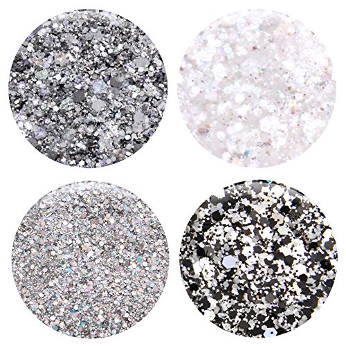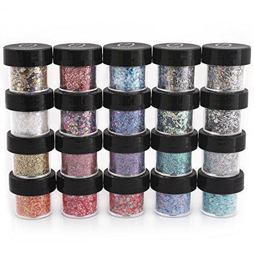 - All 20 glitters are a hand mixed blend of 4-8 different colors, shapes and sizes. This entire 20-piece kit is solvent resistant and can be placed directly into nail lacquers, gel, acrylics, and any other solvents without the glitter particles bleeding color or melting.