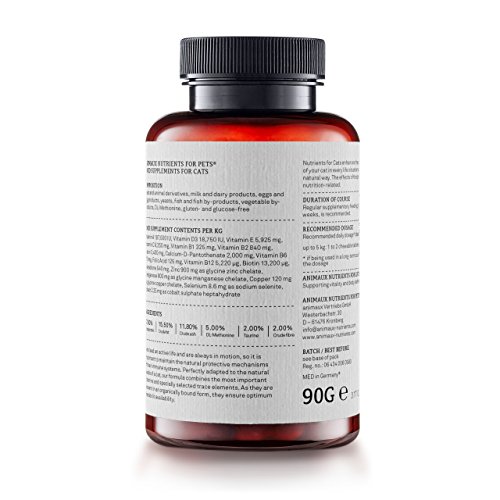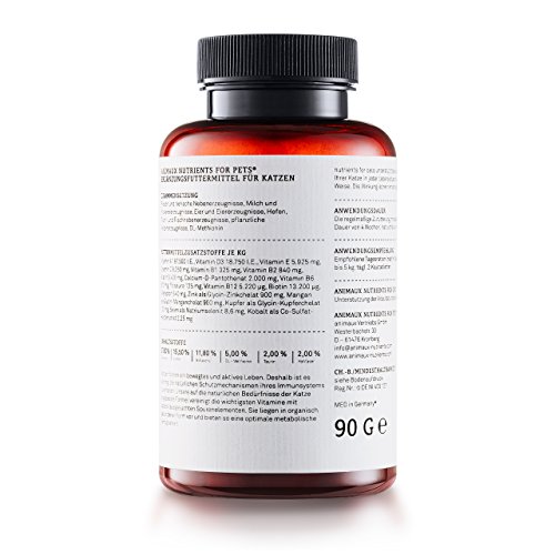 -. Feature : ✅ Food supplement for everyday use. Supports cell protection and strengthens your cat's adaptive immune system with important vitamins, minerals and trace elements / ✅ Organically bound trace elements zinc, manganese and selenium. DL-methionine for a well-balanced metabolism, taurine for vitality and energy. Vitamin A, D, E and K additionally support your cat's senses, nervous system and body regeneration / ✅ Supports cats of every age, older cats and kitten. Long-term or short-term treatment for skin and fur troubles, loss of appetite, diarrhea, sensitive digestion and allergies / ✅ The healthy treat: Purely natural flavor carriers and high taste acceptability. Recommended by veterinarians and animal practitioners / ✅ Free from artificial flavorings, gluten and glucose free. 120 chewable tablets