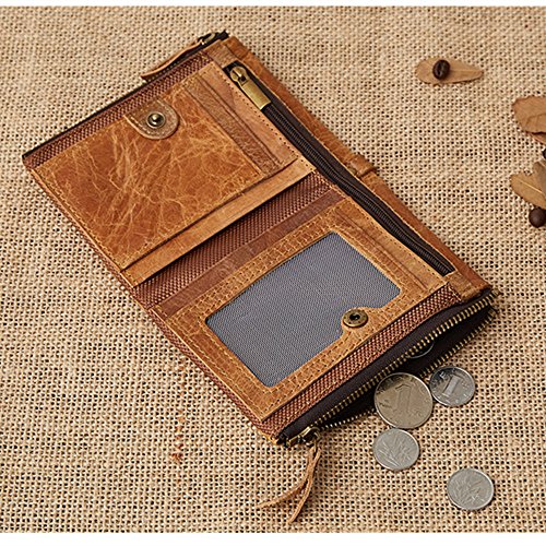 -. Feature : ►100% CRAZY HORSE LEATHER WALLET -- This Wallet is made from Crazy Horse Leather with Inner material of polyester. It has a soft, textured surface and possesses the same flexibility as leather which is old fashion and vintage. / ►RFID BLOCKING DESIGN: - The RFID protection card holder can perfectly block unwanted RFID scanners, to protect your personal information, like ID Card, Credit Card, it is really necessary when walking out. / ►DOUBLE ZIPPER CREATIVE DESIGH -- Double zipper independent pocket,according to your needs convenience storage classification,fashion,clean and tidy. / ►FUCTIONAL CAPACITY -- 2 note compartment,6 card holder,1 photo holder,2 coin pocket,1 outside pocket for keys changes or other little things.And you can use it in any occasion such as casual,school day,business and so on. / ►HIGH QUALITY COIN PORKET -- Metal zipper,rigorous testing procedures,fine workmanship and smooth wearable.Coin is portable,easy carry and storage.