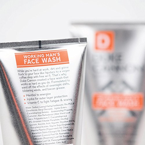 Studio : DUKE CANNON SUPPLY CO. Publisher : DUKE CANNON SUPPLY CO. Binding : Misc. Product Description Duke Cannon - Working Man's Face Wash - Smells Like Productivity. While you're hard at work, dirt and grime flock to your face like hipsters to a vegan coffee shop with free wi-fi. That's why Duke Cannon created a face wash that works as hard as you do. Formulated to ward off the effects of double shifts, blistering winds, and bacon grease, it has a refreshing citrus scent and a little grit for optimal cleansing. // Made with premium ingredients: - Menthol to energize. - Jojoba for outer layer protection. - Vitamin C to fight fatigue and scurvy (yes, scurvy - it's a real threat that other products seem to ignore). A portion of proceeds benefits US Veterans. Made in the USA. 0
