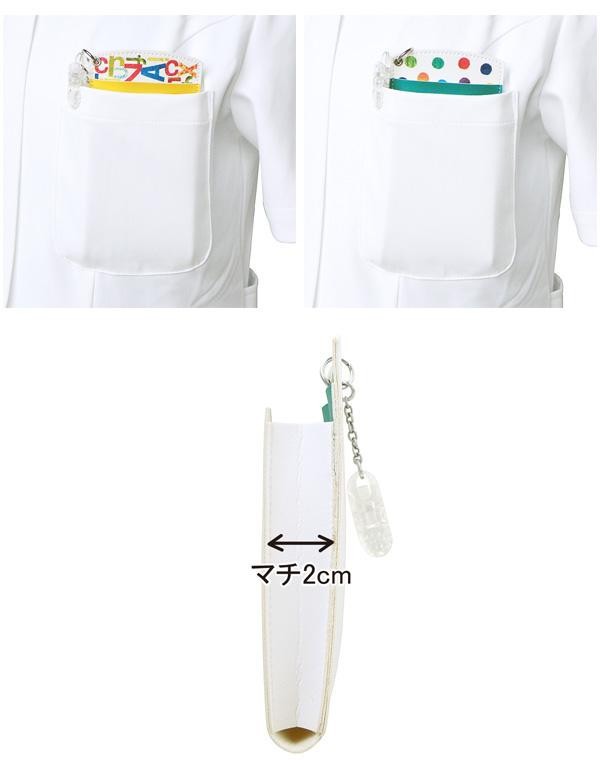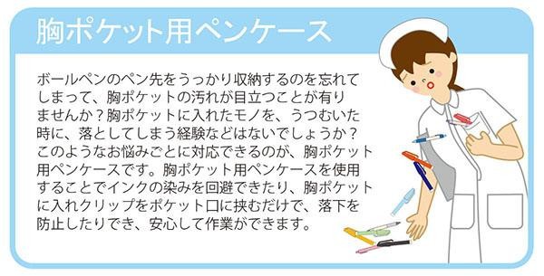 | 胸ポケット用のペンケースを使用することでインクの染みや洗濯時のペンの取り忘れを回避できます。又、落下防止の為のクリップも付いています。 |