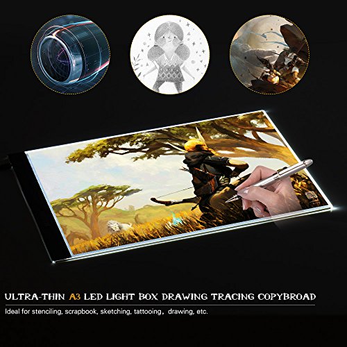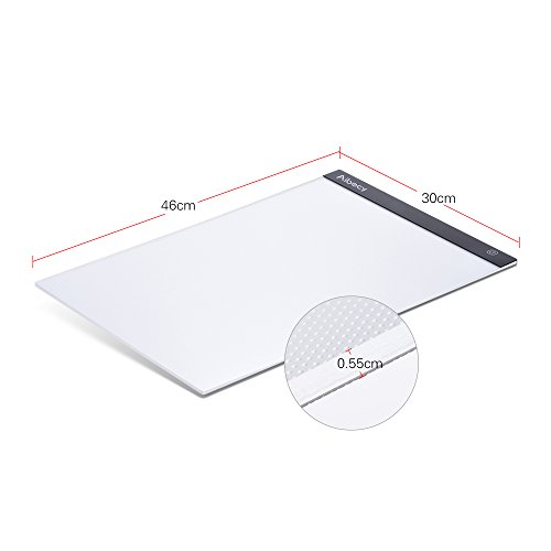 Studio : Aibecy Publisher : Aibecy Binding : Electronics Product Description Features: A3 LED light box drawing tracing board, large light area, perfect for stenciling, scrapbook, sketching, tattooing drawing, etc. Eye-protecting even light, long press the button, stepless brightness control for adjusting to a optimum light degree. Smart brightness memory function, turn on and automatically enter into the brightness of your last use. Compact structure delicate design, 5mm of thickness, approx. 46 * 30cm /? * 9.3in of all frame. High transparent acrylic panel with great toughness durability. Micro USB interface for power supply, comes with a USB cable but the adapter is not included. Easy to use, insert the plug turn it on, then you can start your creative work.