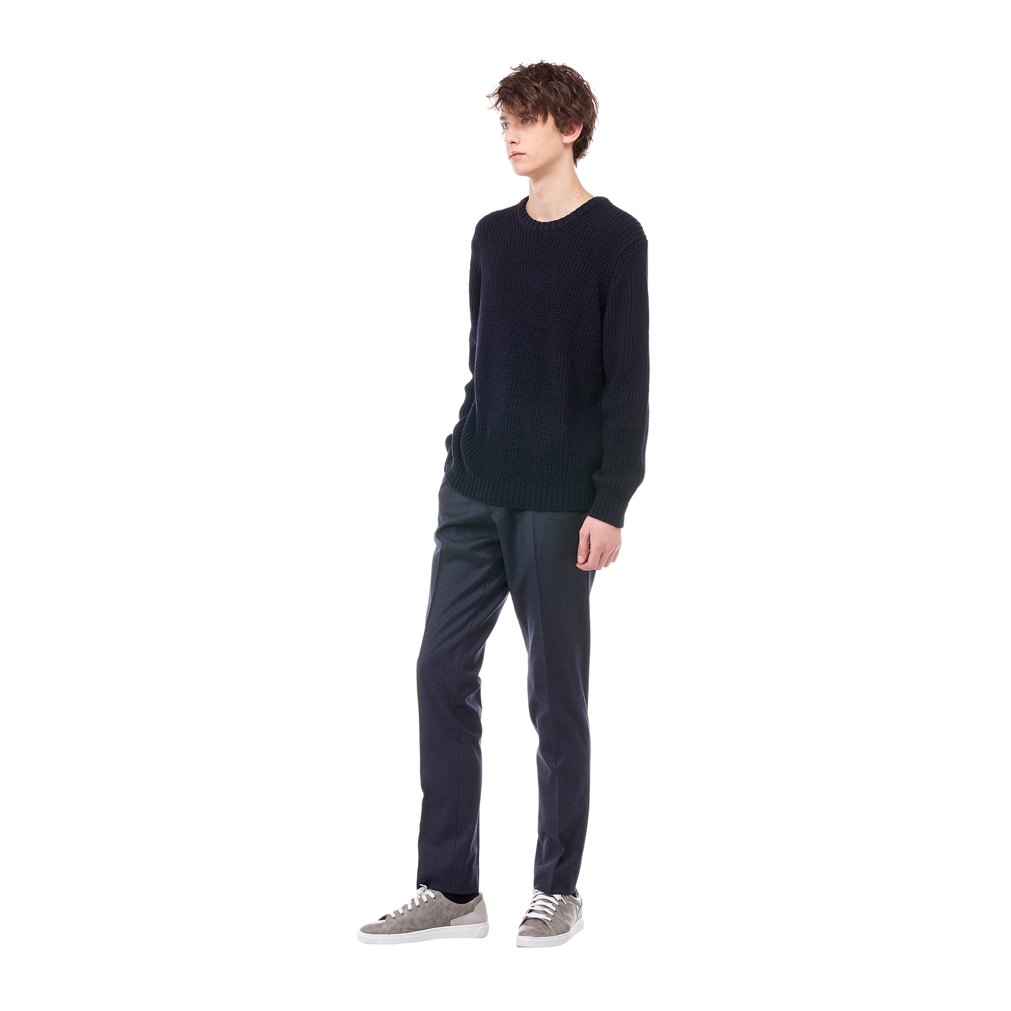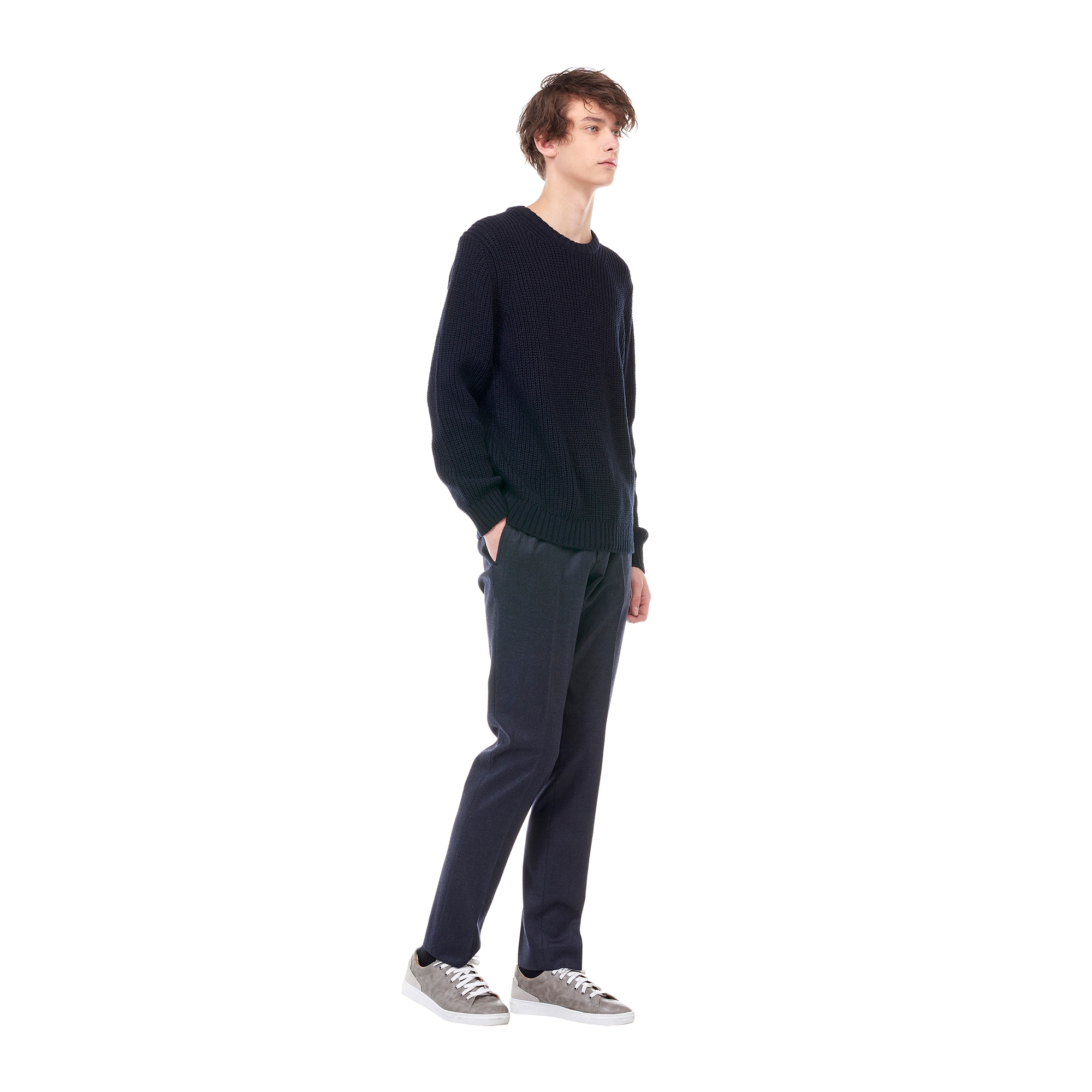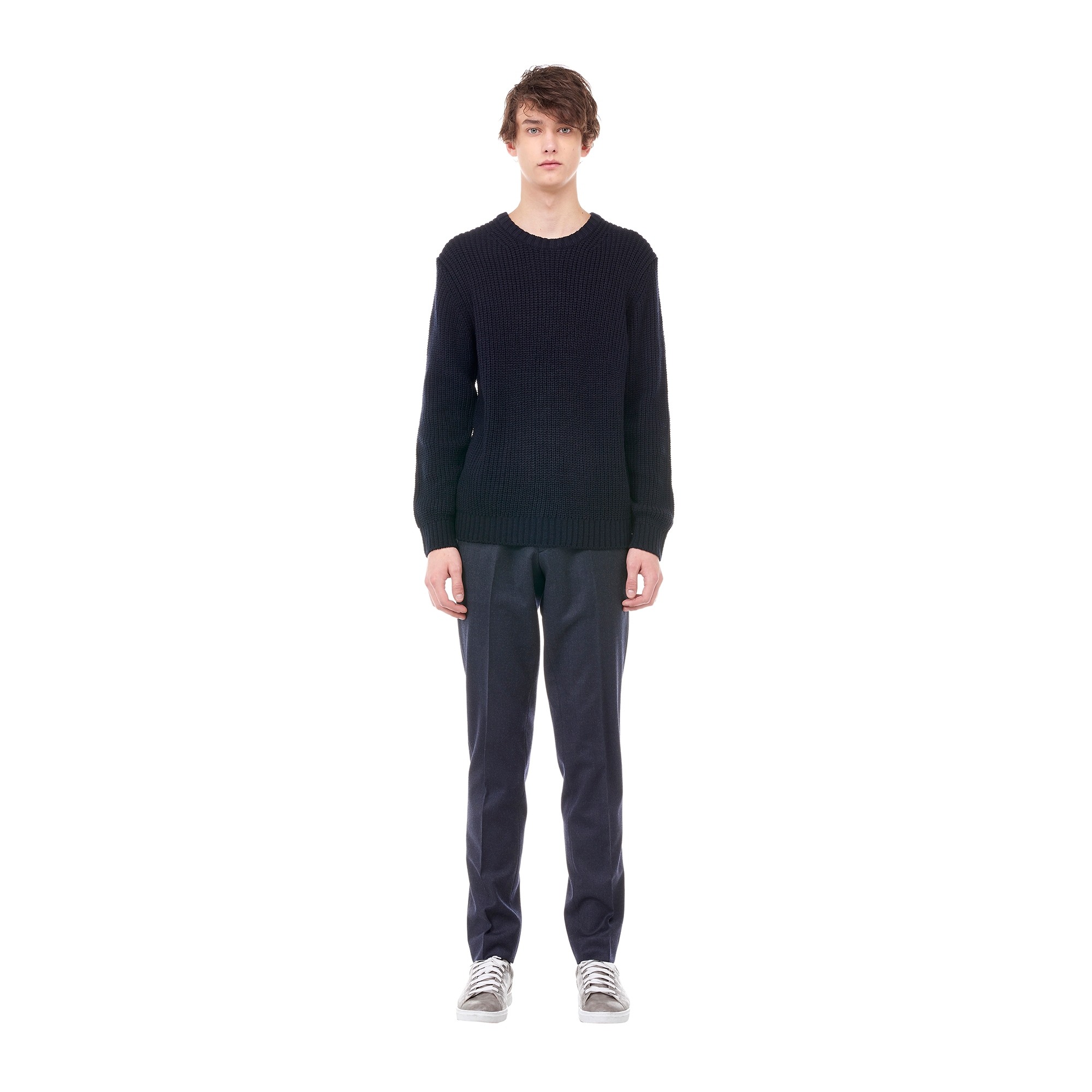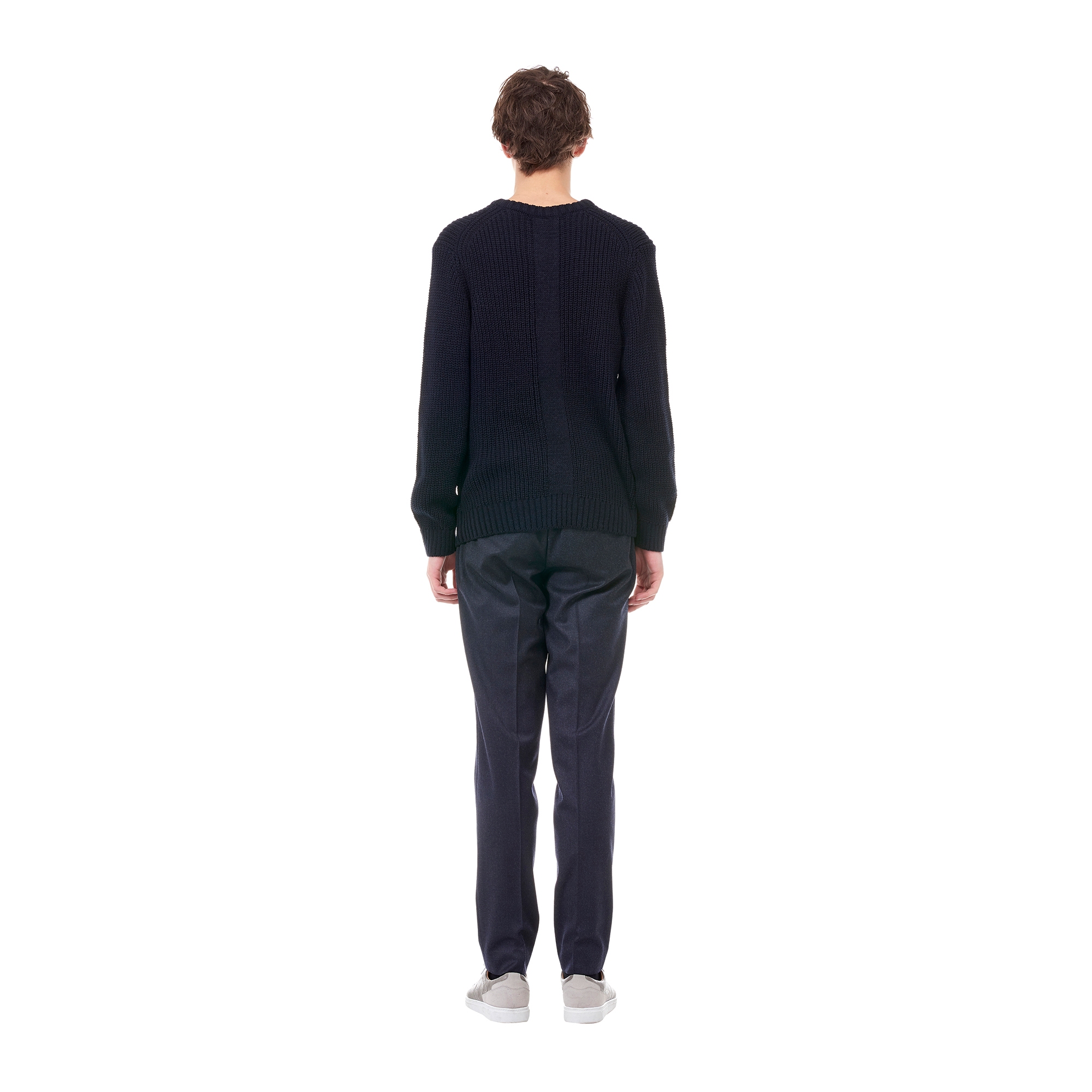 컬렉션 : 2017 Fall/Winter 디자인 포인트 : - 도톰한 조직감이 남성스러운 느낌을 주는 네이비 컬러 니트- 라운드넥 디테일과 베이직한 핏을 가진 디자인- 넥라인과 밑단 등에 립 조직 디테일로 포인트를 더한 아이템 스타일링 추천 : 베이직한 치노 팬츠 혹은 슬랙스 팬츠와 코트에 포멀하게 스타일링 할 수 있음
