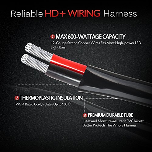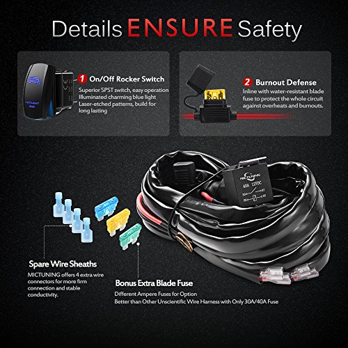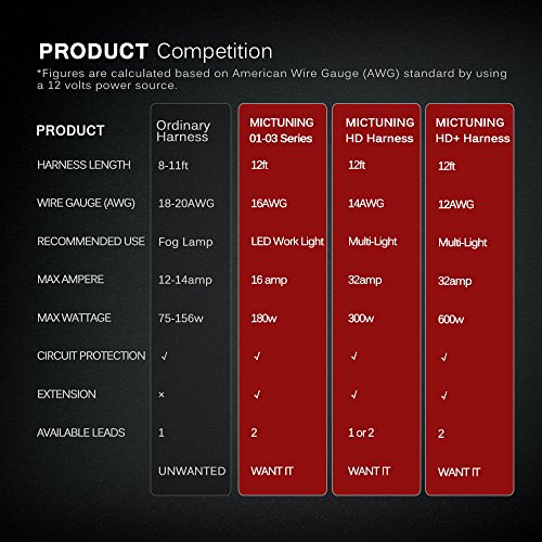 - MICTUNING HD+ Wiring Harness Kit with 2-Leads - Ultra Heavy Duty 12-Gauge wires, up to 600W load capacity, suitable for offroad light bar, HID work lights, Spot lights, Fog lights and other auxiliary lamps, Your Expensive High-power LED Lights Deserved for Superior Quality Harness!