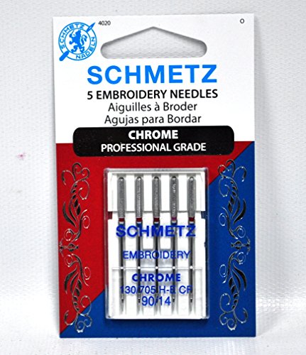 -. Feature : Chrome Embroidery needle, size 90/14. / 5 Embroidery Needles in Pack. / Use Schmetz Embroidery Needles with rayon, polyester, and other specialty embroidery threads. Has a special scarf, widened groove and enlarged eye to protect fragile threads against excess friction. / Chrome Professional Grade. / Item No.: 4020