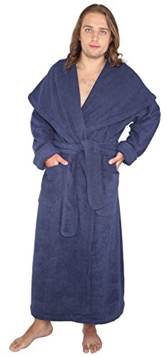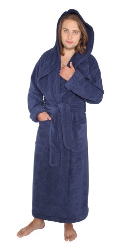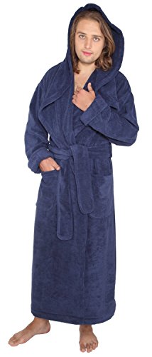 Arus Men's Monk Robe Style Full Length Long Hooded Turkish Terry Cloth Bathrobe, Large, Navy Marine